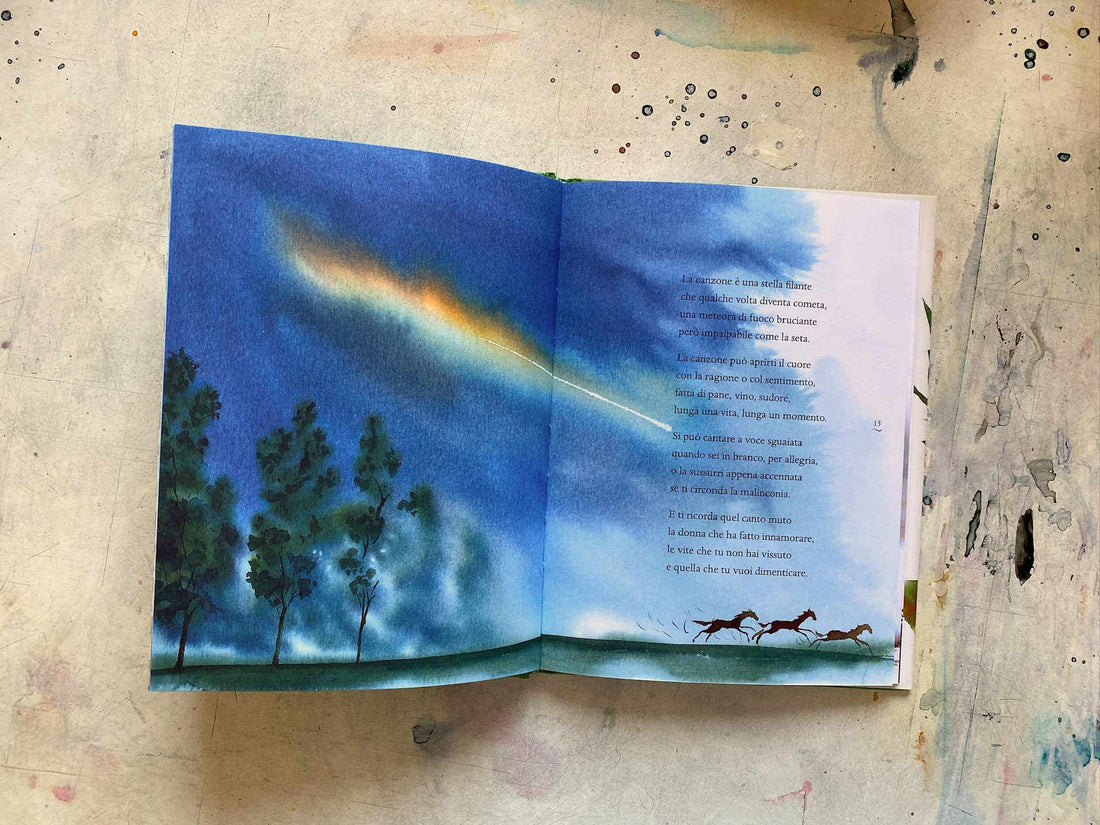 "Una farfalla che vola leggera... il sapore dell'uva rubato a un filare... un sogno che più non ritrovi": sono questo, e molto altro, le canzoni di Francesco Guccini. Sono la colonna sonora di più generazioni, raccontano quello che si lascia e si conquista quando si diventa grandi, parlano dei cambiamenti, del mondo a volte crudele che ci circonda, di una consapevolezza che si disvela per squarci improvvisi. Sono una scatola magica per adulti e bambini: custodiscono storie per tutti, in cui tutti possono riconoscere la propria storia. Capolavori senza tempo, poesie per ogni età. "Una canzone", "Culodritto", "Il vecchio e il bambino", "Auschwitz", "Piccola città", "E un giorno...", "L'ultima volta", dalla ricca produzione dell'artista sette canzoni, sette poesie sul tema dell'infanzia, del ricordo e del sogno, illustrate da Alessandro Sanna.