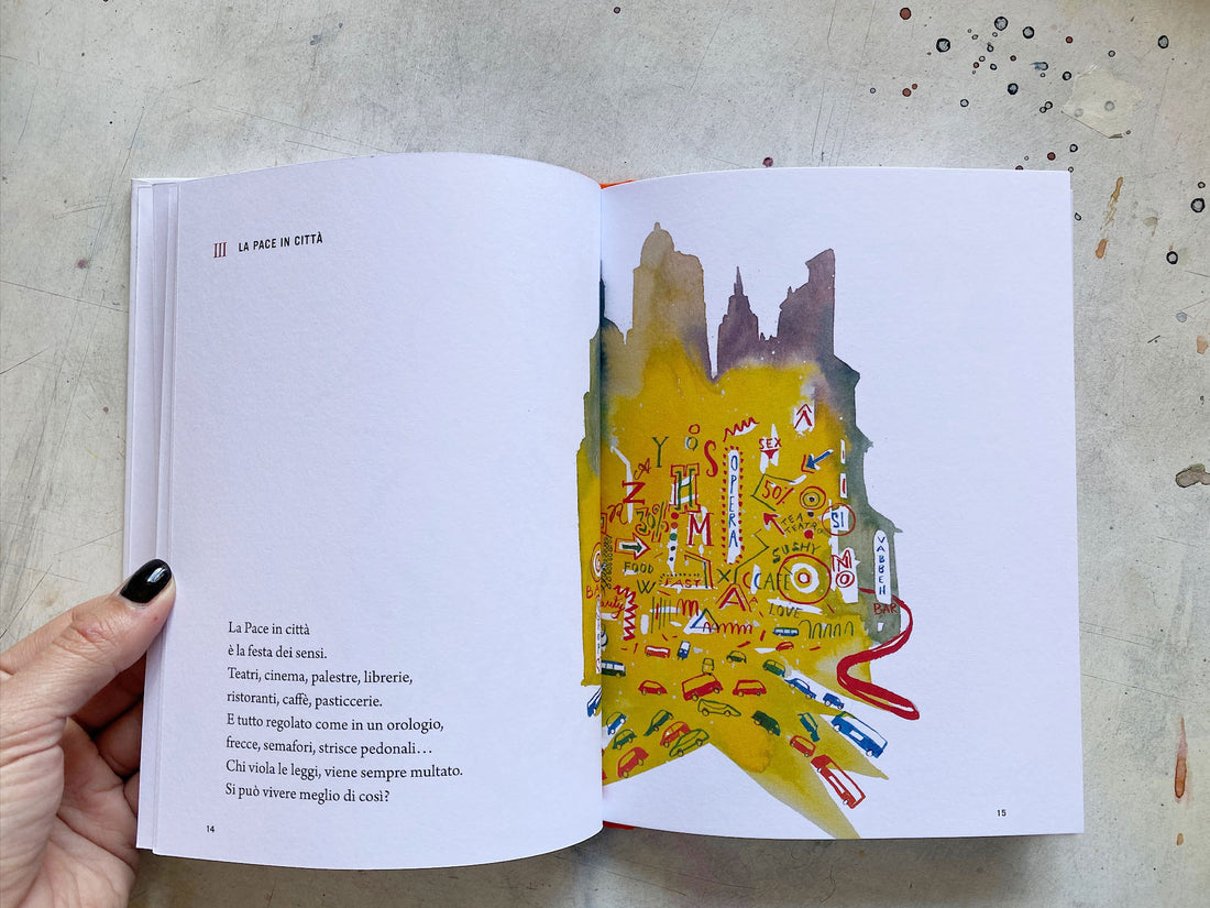Come si racconta la guerra? E come si racconta la pace? Mettendole a confronto, ci dice Valerio Magrelli in questo libro prezioso per piccoli e grandi, dove coppie di poesie si rincorrono componendo quadri di vita di tutti i giorni. Le scene sono le stesse, a cambiare è il tempo. Un tempo di guerra, come quando nella neve c'è "un'aria bianca, frizzante, natalizia, ma nessuno che nasce". O un tempo di pace, come quando nella neve c'è "un'aria bianca, frizzante, natalizia, che spinge il mondo a rinascere". Basta guardarli, questi quadri, e poi spostare lo sguardo sulle illustrazioni di Alessandro Sanna, per sentire sulla nostra pelle il male inconcepibile della guerra e la gioia sconfinata della pace. Età di lettura: da 10 anni.